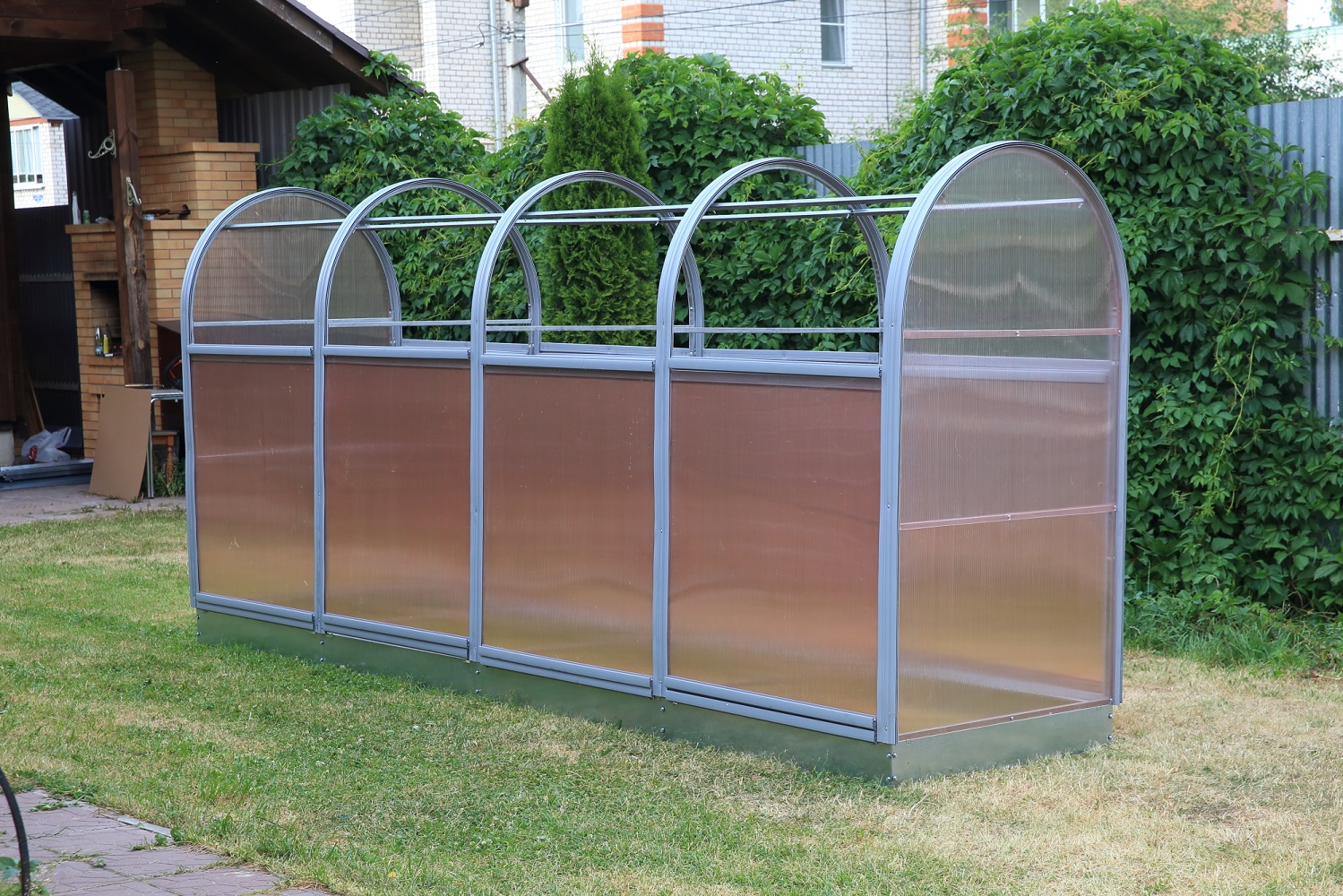 Каркас из оцинкованной снаружи и внутри трубы 20х20 мм не подвергается коррозии. Секции шириной 1 м удобно сдвигать и фиксировать с одной или каждой стороны, все сразу или выборочно. Они убираются внутрь парника.